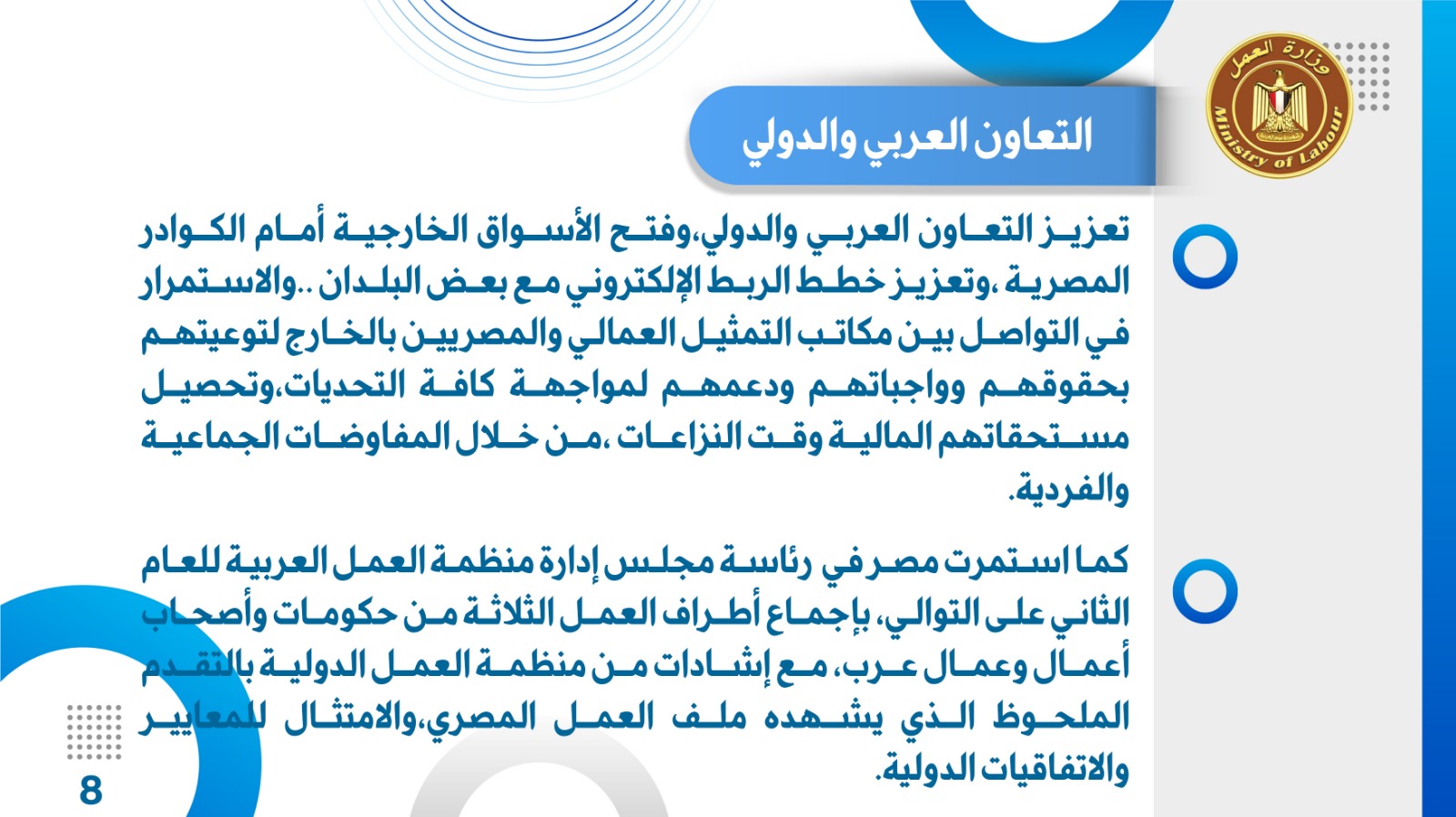 تعزيز التعاون العربي والدولي، وفتح الأسواق الخارجية أمام الكوادر المصرية ،وتعزيز خطط الربط الإلكتروني مع بعض البلدان ..والاستمرار في التواصل بين مكاتب التمثيل العمالي والمصريين بالخارج لتوعيتهم بحقوقهم وواجباتهم ودعمهم لمواجهة كافة التحديات،وتحصيل مستحقاتهم المالية وقت النزاعات ،من خلال المفاوضات الجماعية والفردية.