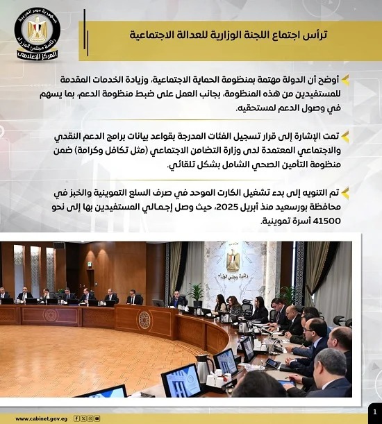 وتضمنت الأنشطة، ترؤس رئيس الوزراء اجتماع اللجنة الوزارية للعدالة الاجتماعية، موضحًا أن الدولة مهتمة بمنظومة الحماية الاجتماعية، وزيادة الخدمات المقدمة للمستفيدين من هذه المنظومة، كما تمت الإشارة إلى قرار تسجيل الفئات المدرجة بقواعد بيانات برامج الدعم النقدي والاجتماعي المعتمدة لدى وزارة التضامن الاجتماعي (مثل تكافل وكرامة) ضمن منظومة التأمين الصحي الشامل بشكل تلقائي.