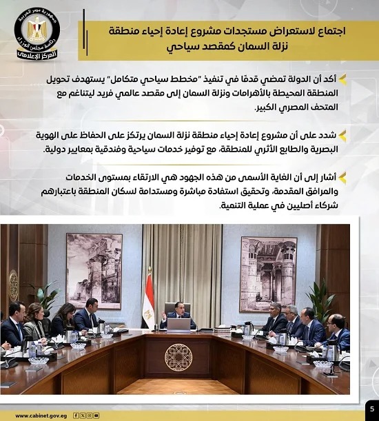كما عقد رئيس الوزراء اجتماعًا لاستعراض مستجدات مشروع إعادة إحياء منطقة نزلة السمان كمقصد سياحي، مؤكدًا أن الدولة تمضي قدمًا في تنفيذ "مخطط سياحي متكامل" يستهدف تحويل المنطقة المحيطة بالأهرامات ونزلة السمان إلى مقصد عالمي فريد، مُشددًا أن المشروع يرتكز على الحفاظ على الهوية البصرية والطابع الأثري للمنطقة، مع توفير خدمات سياحية وفندقية بمعايير دولية، إلى جانب الارتقاء بمستوى الخدمات والمرافق المقدمة، وتحقيق استفادة مباشرة ومستدامة لسكان المنطقة باعتبارهم شركاء أصليين في عملية التنمية.