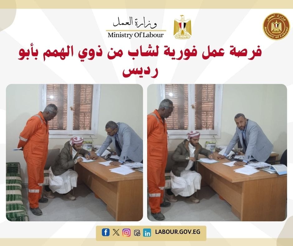 في استجابة سريعة، وفر مكتب عمل أبو رديس بجنوب سيناء فرصة عمل مناسبة لأحد الشباب من ذوي القدرات الخاصة في إحدى المنشآت بالمنطقة. وأكد أكرم محمد مدير المديرية، أن هذه الجهود تأتي لضمان حق ذوي الهمم في العمل اللائق ودمجهم في النسيج الاقتصادي للمحافظة.