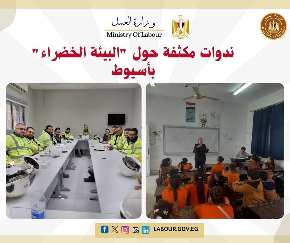 عقدت مديرية العمل بأسيوط سلسلة ندوات شملت الإدارة التعليمية بمنفلوط، وشركات الإسمنت والمطاحن، ومستشفيات الجامعة. ركزت الندوات على مخاطر بيئة العمل الفيزيائية والكيميائية، ونشر ثقافة "الاقتصاد الأخضر" وأهداف التنمية المستدامة، بمشاركة واسعة من العمال والطلاب والمهندسين.