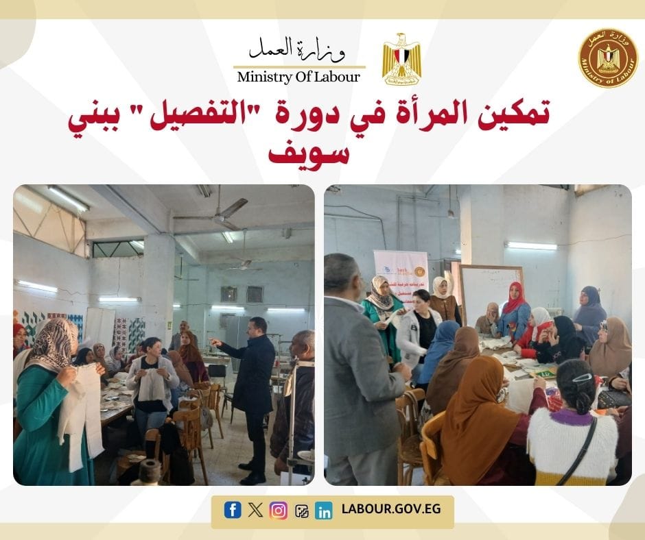 تابع المهندس أحمد العربي، مدير مديرية العمل ببني سويف، سير العملية التدريبية بورش الخياطة بمركز التدريب المهني شرق النيل. يستهدف البرنامج تدريب 15 فتاة على فنون الحياكة، بهدف تحويلهن إلى صاحبات مشروعات صغيرة وتعزيز التمكين الاقتصادي للمرأة بالمحافظة.