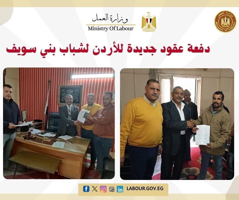 في مستهل العام الجديد 2026، سلمت مديرية العمل ببني سويف 13 عقد عمل لشباب المحافظة للعمل بدولة الأردن. وأكدت المديرية أن هذه العقود تمت عبر المسار الرسمي لوزارة العمل، لضمان حماية حقوق العمال المصريين في الخارج وتوفير كافة الضمانات القانونية لهم.