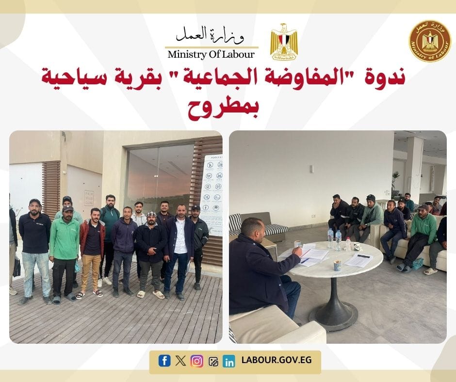 نظمت مديرية العمل بمطروح، بتوجيهات من مصطفى جابر مدير المديرية، ندوة توعوية بقرية "ايسلندا باي" حول آليات المفاوضة الجماعية. ركزت الندوة على التعريف بحقوق وواجبات طرفي الإنتاج في ضوء القانون الجديد، لضمان استقرار علاقات العمل داخل المنشآت السياحية.