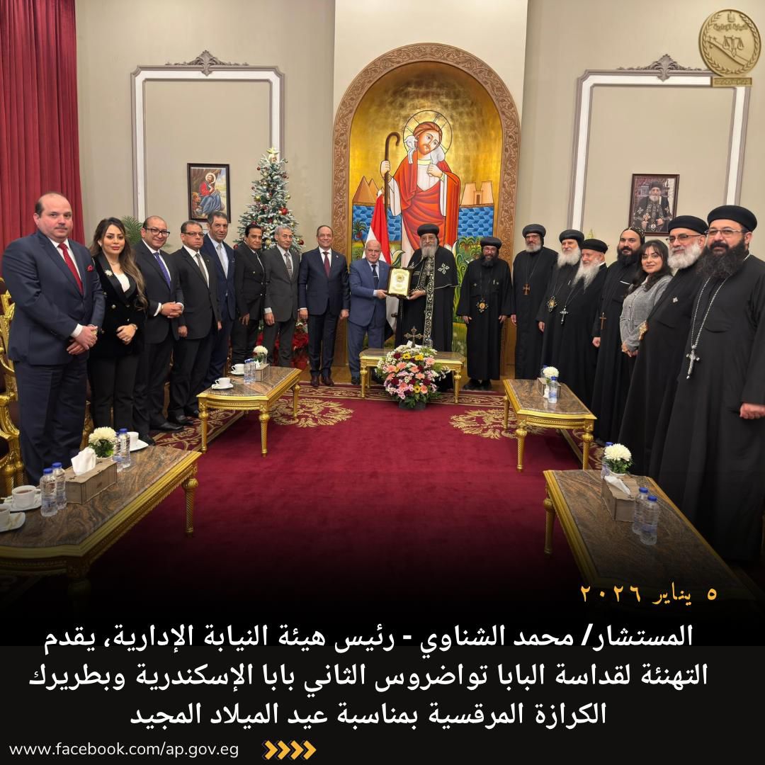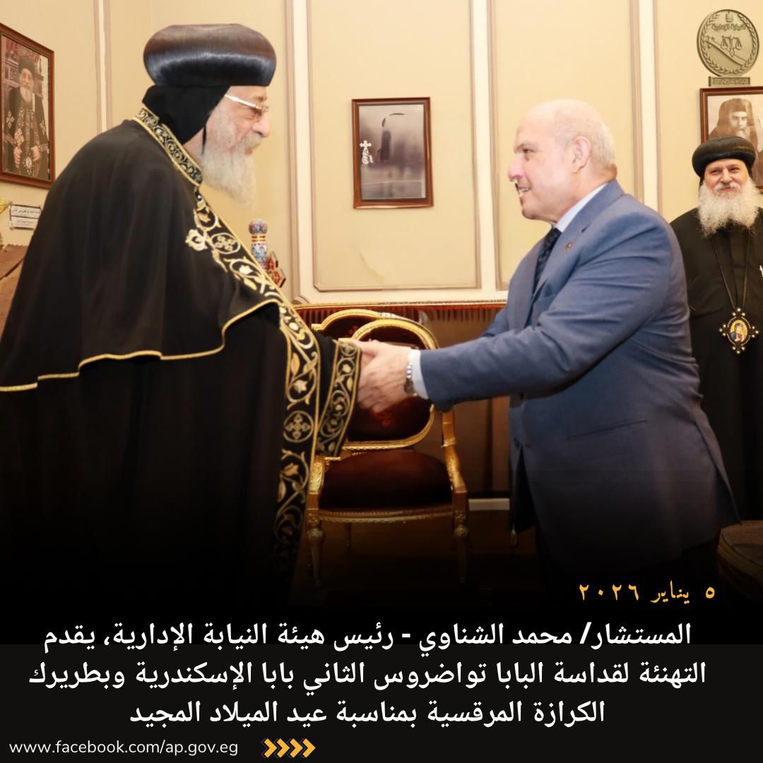 قام المستشار محمد الشناوي – رئيس هيئة النيابة الإدارية، اليوم الاثنين الموافق ٥ يناير ٢٠٢٦، بزيارة قداسة البابا تواضروس الثاني بابا الإسكندرية وبطريرك الكرازة المرقسية؛ للتهنئة بعيد الميلاد المجيد.