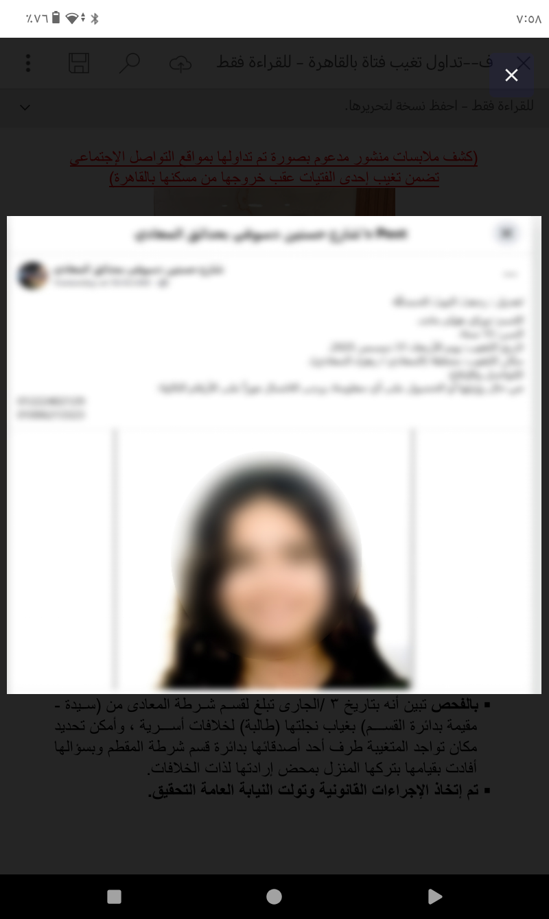 جاء ذلك فى إطار كشف ملابسات منشور مدعوم بصورة تم تداولها بمواقع التواصل الإجتماعى تضمن تغيب إحدى الطالبات عقب خروجها من مسكنها بالقاهرة.