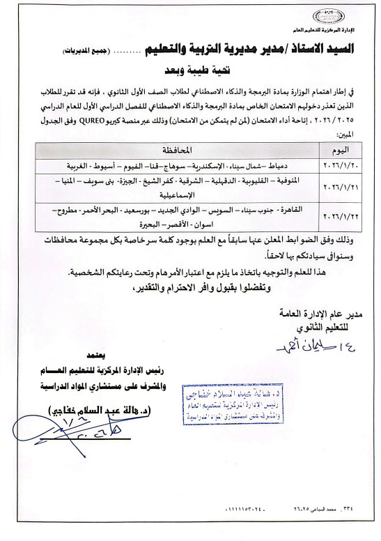 وتعقد إعادة امتحان البرمجة والذكاء الاصطناعي لطلاب أولى ثانوي المذكورين، وفقا للضوابط المعلن عنها سابقا مع العلم وجود كلمة سر خاصة بكل مجموعة محافظات.