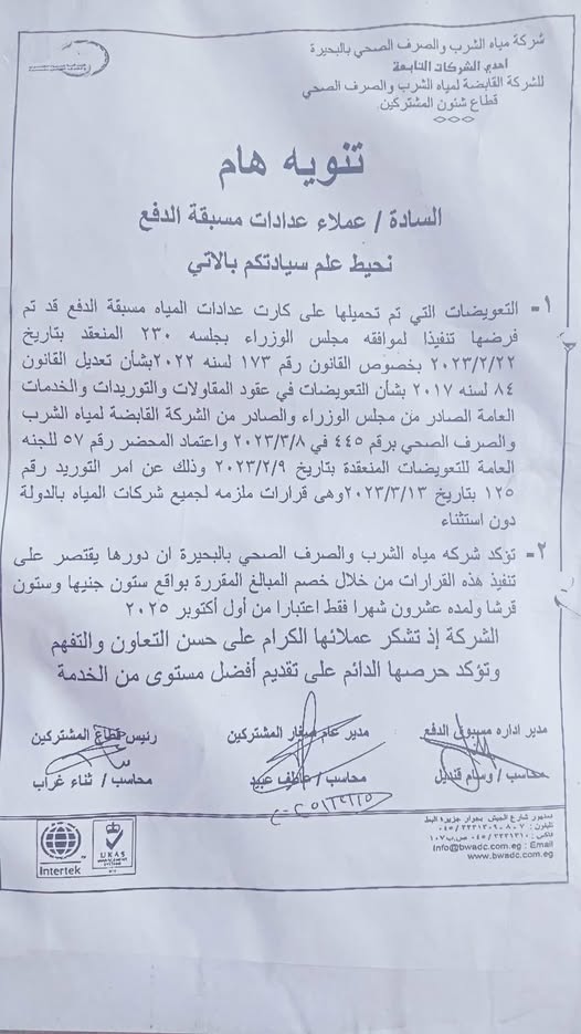 وجاء البيان التوضحي :التعويضات التي تم تحميلها على كارت عدادات المياه مسبقة الدفع قد تم فرضها تنفيذاً لموافقة مجلس الوزراء بجلسة 230 المنعقد بتاريخ 2023/2/22 بخصوص القانون رقم 173 لسنة 2022 بشأن تعديل القانون 84 لسنة 2017 بشأن التعويضات في عقود المقاولات والتوريدات والخدمات العامة الصادر من مجلس الوزراء والصادر من الشركة القابضة لمياه الشرب والصرف الصحي برقم 445 في 2023/3/8 واعتماد المحضر رقم 57 للجنة العامة للتعويضات المنعقدة بتاريخ 2023/2/9 وذلك عن أمر التوريد رقم 125 بتاريخ 2023/3/13 وهى قرارات ملزمة لجميع شركات المياه بالدولة دون استثناء.