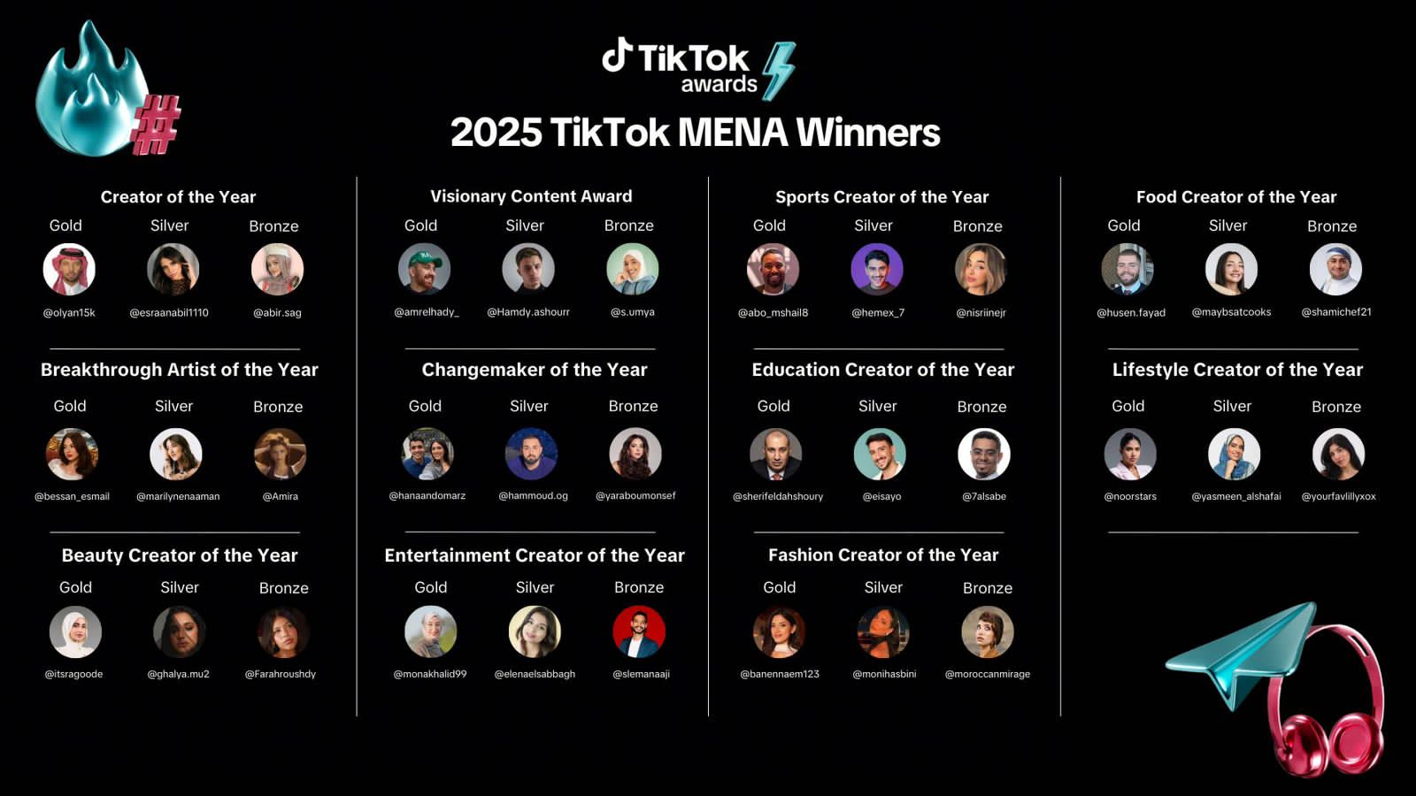 إليكم القائمة الكاملة بالفائزين بجائزة أفضل صانع محتوى في "تيك توك" الشرق الأوسط وشمال أفريقيا: