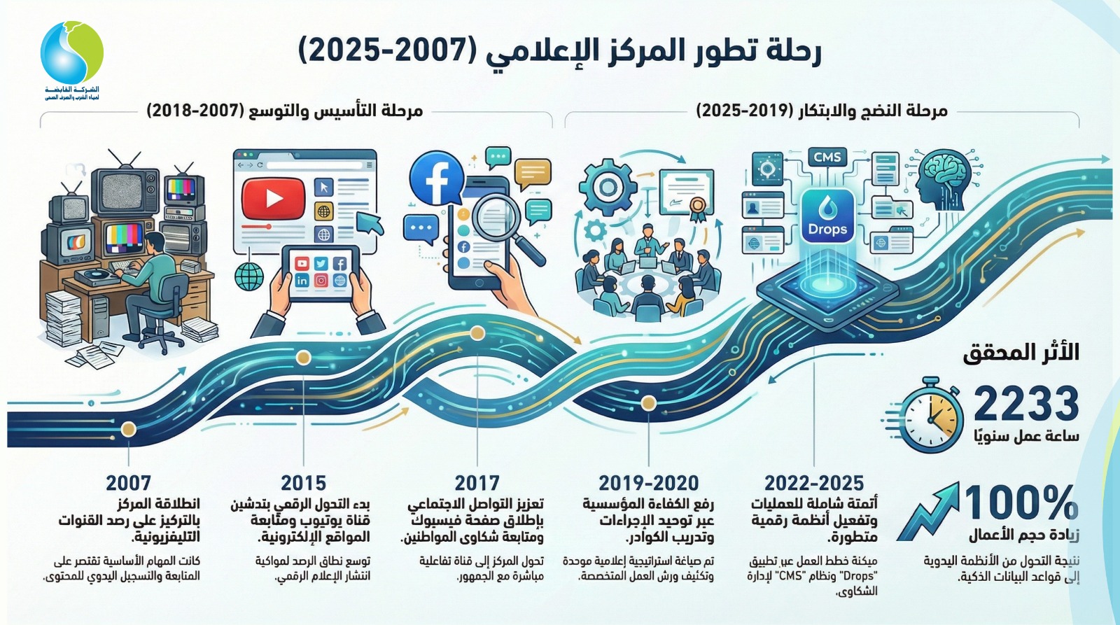 وأكدت الشركة القابضة أن حصاد عام 2025 يعكس التطور المستمر في أداء إدارة الإعلام، سواء على مستوى الرصد والتحليل الإعلامي، أو التواصل الرقمي، أو دعم الحملات التوعوية والمشروعات القومية، بما يعزز من دور الإعلام كأداة رئيسية في دعم السياسات العامة لقطاع مياه الشرب والصرف الصحي، وترسيخ الوعي المجتمعي، وتحقيق التواصل الفعال مع المواطنين.