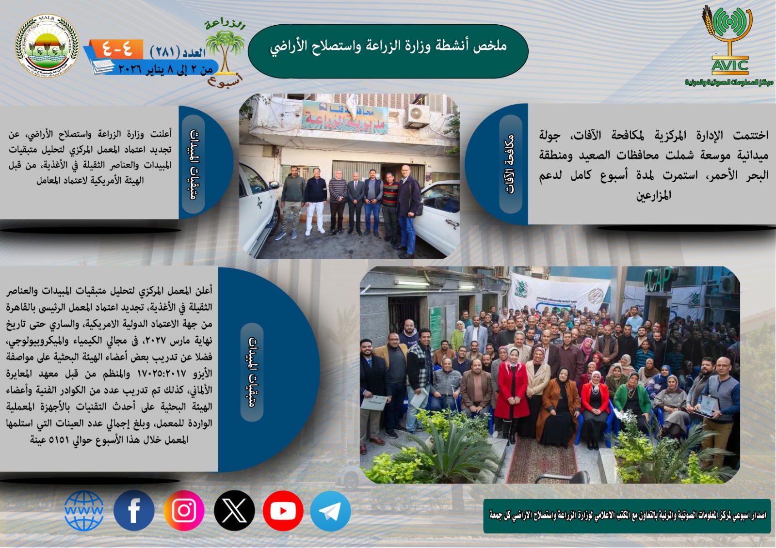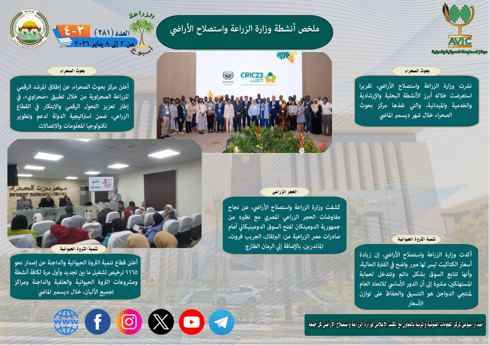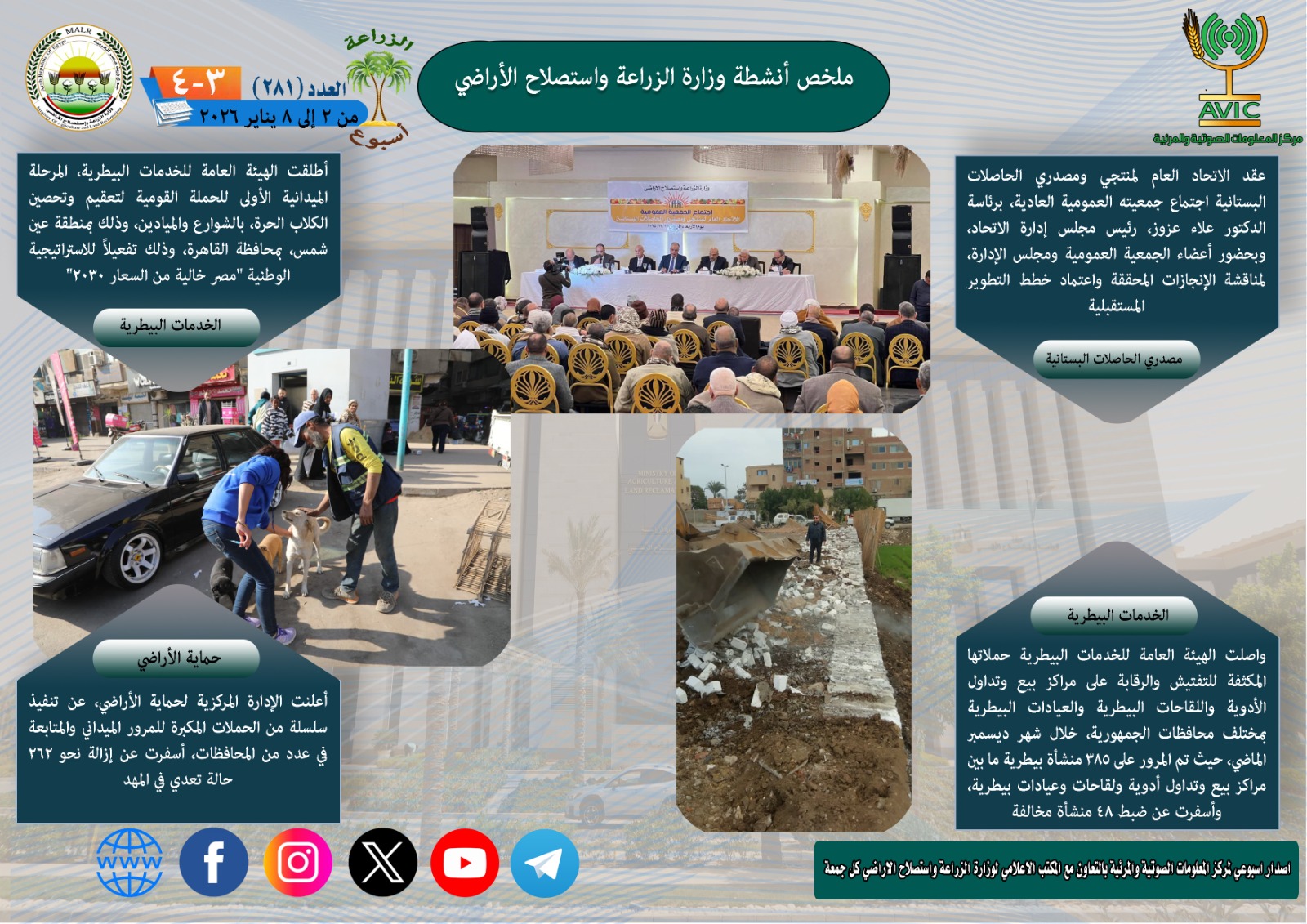 أصدر مركز المعلومات الصوتية والمرئية بوزارة الزراعة واستصلاح الأراضي النسخة رقم 281 من "الانفوجراف الأسبوعي"، لتسليط الضوء على أبرز أنشطة الوزارة خلال الفترة من 2 حتى 8 يناير الجاري، إلى جانب ملخص فيديو يلخص نفس الفترة.