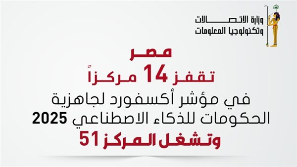 جاءت مصر فى المرتبة الأولى إفريقيًا فى مؤشر جاهزية الحكومات للذكاء الاصطناعى لعام 2025 الصادر عن Oxford Insights، حيث تقدمت 14 مركزًا في المؤشر لتشغل المركز 51 عالميًا من بين 195 دولة، محققة 57.5 نقطة، مقارنة بالمركز 65 من بين 188 دولة محققة 55.6 نقطة فى عام 2024. كما جاءت مصر فى المرتبة الثالثة عربيًا، مقابل المركز السابع عربيًا فى العام الماضى.