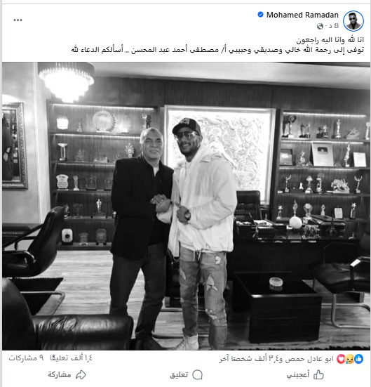 أعلن النجم محمد رمضان وفاة خاله، وعلق قائلا على صفحته الخاصة بموقع فيس بوك: إنا لله وإنا إليه راجعون، توفى إلى رحمة الله خالي وصديقي وحبيبي مصطفى أحمد عبد المحسن أسألكم الدعاء لله.
