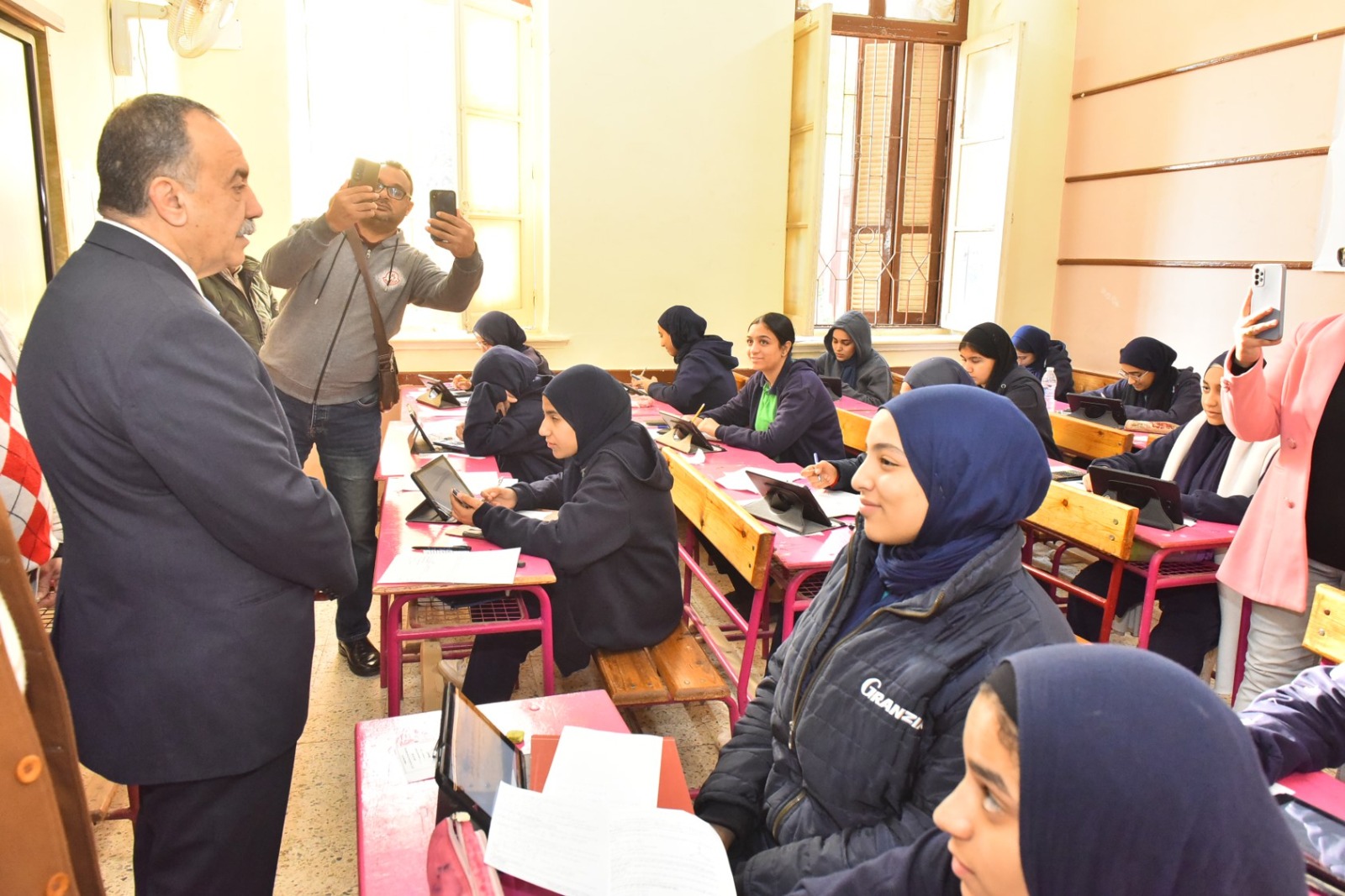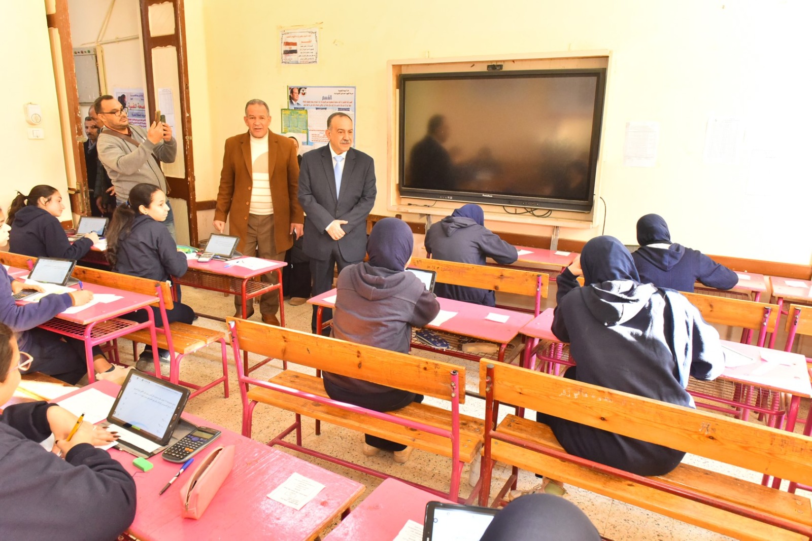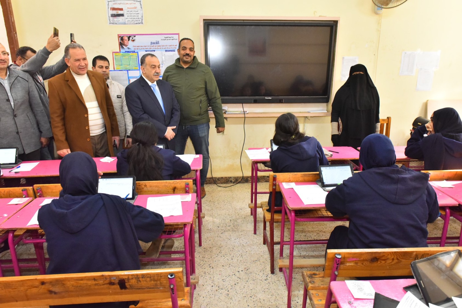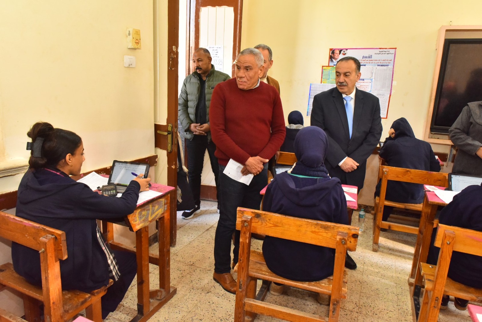 واستهل المحافظ جولته بتفقد لجان امتحانات مدرسة الشهيد أحمد فايز الثانوية بنات، حيث تابع لجان الصف الثاني الثانوي (نظامي، منازل، خدمات)، واطمأن على سير الامتحان في مادة الرياضيات، التي يؤديها طلاب النظامي باستخدام أجهزة التابلت، بينما يؤديها طلاب المنازل والخدمات ورقيًا، كما استمع إلى آراء الطالبات حول مستوى الامتحان ووضوح الأسئلة، وتأكد من عدم وجود أية معوقات فنية أثناء أداء الامتحانات الإلكترونية.