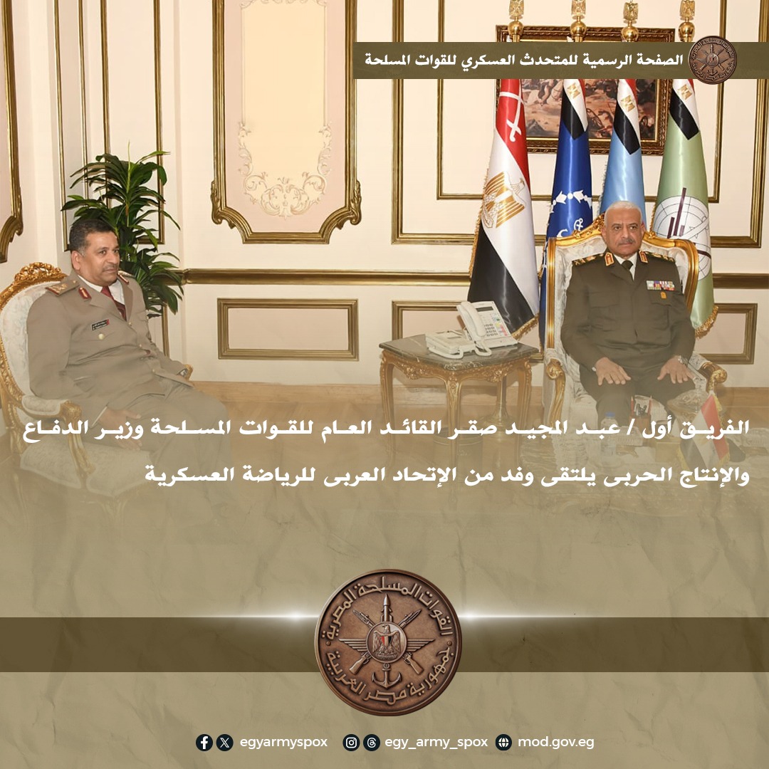 التقى الفريق أول عبد المجيد صقر القائد العام للقوات المسلحة وزير الدفاع والإنتاج الحربى اللواء الركن يوسف دسمال مبارك الكوارى رئيس الاتحاد العربى للرياضة العسكرية، بحضور الفريق أحمد خليفة رئيس أركان حرب القوات المسلحة وذلك بمقر الأمانة العامة لوزارة الدفاع .