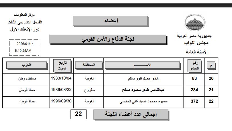 أعلن مجلس النواب رغبات النواب في الانضمام للجان النوعية وجاءت رغبات النواب في الانضمام للجنة الدفاع والأمن القومي، إحدى اللجان النوعية الأكثر أهمية بالمجلس، في إطار استكمال الإجراءات التنظيمية لدور الانعقاد العادي الأول من الفصل التشريعي الثالث، وتضم اللجنة نخبة من النواب ذوي الخبرة ، بما يعزز دورها المحوري في دراسة مشروعات القوانين، ومراجعة التعديلات الدستورية، وترسيخ أسس العمل البرلماني.
