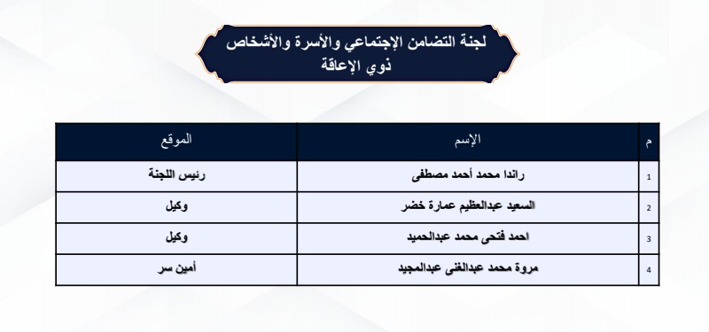 أسفرت انتخابات لجنة التضامن الاجتماعى والأسرة والأشخاص ذوى الإعاقة بمجلس النواب عن فوز النائب راندا محمد أحمد مصطفى بمنصب رئيس اللجنة، وفاز النائبان السعيد عبدالعظيم عمارة خضر، و أحمد فتحي محمد عبدالحميد بمقعدي الوكيلين، والنائب مروة محمد عبدالغني عبدالمجيد، بمقعد أمين السر.