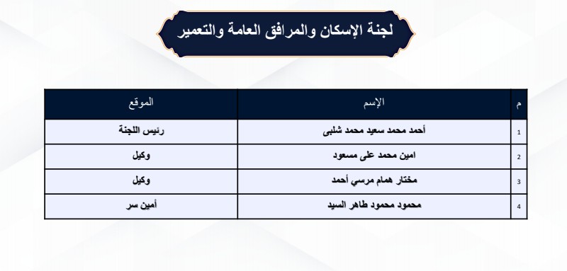 أسفرت انتخابات لجنة الإسكان والمرافق العامة والتعمير بمجلس النواب عن فوز النائب أحمد محمد سعيد محمد شلبي بمنصب رئيس اللجنة، وفاز النائبان أمين محمد علي مسعود، و مختار همام مرسي أحمد بمقعدي الوكيلين، والنائب محمود محمود طاهر السيد، بمقعد أمين السر.