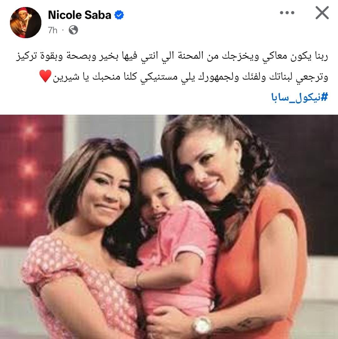 وشاركت نيكول سابا جمهوره صورة جمعتهما سويًا، وذلك من خلال حسابها الرسمي عبر موقع التواصل الاجتماعي فيسبوك، وكتبت: ربنا يكون معاكي ويخرجك من المحنة اللي انتي فيها بخير وبصحة وبقوة تركيز، وترجعي لبناتك ولفنك ولجمهورك يلي مستنيكي.. كلنا بنحبك يا شيرين.