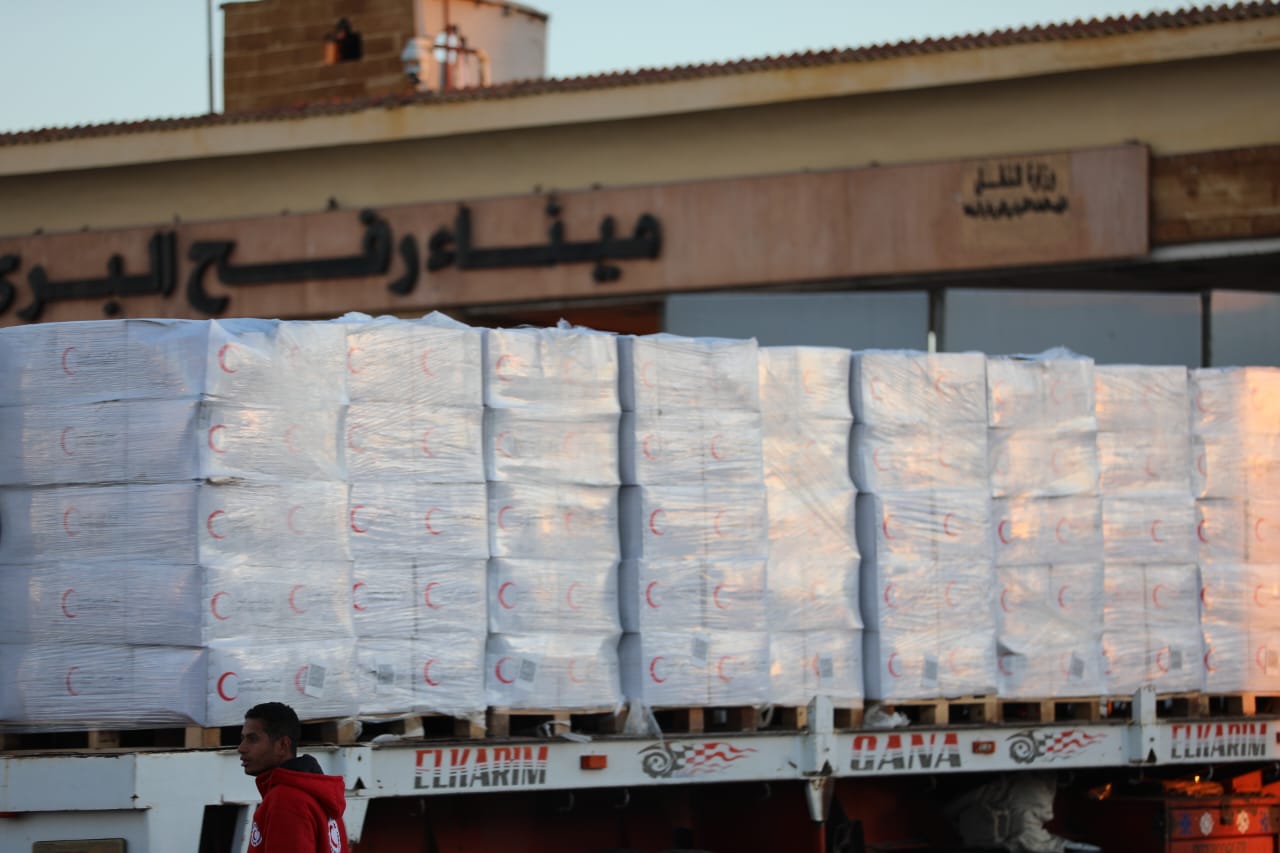 ويتواجد الهلال الأحمر المصري كآلية وطنية لتنسيق وتفويج المساعدات إلى غزة، على الحدود منذ بدء الأزمة حيث لم يتم غلق معبر رفح من الجانب المصري نهائيًا، وواصل تأهبه فى كافة المراكز اللوجستية وجهوده المتواصلة لدخول المساعدات التي بلغت أكثر من نصف مليون طن من المساعدات الإنسانية والإغاثة، وذلك بجهود 65 ألف متطوع بالجمعية.