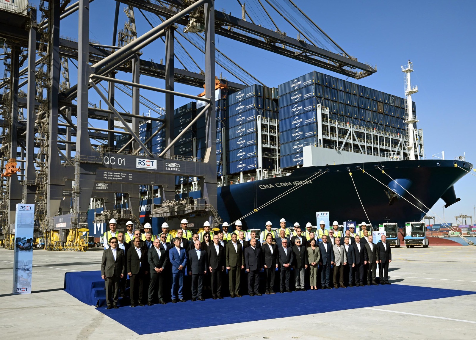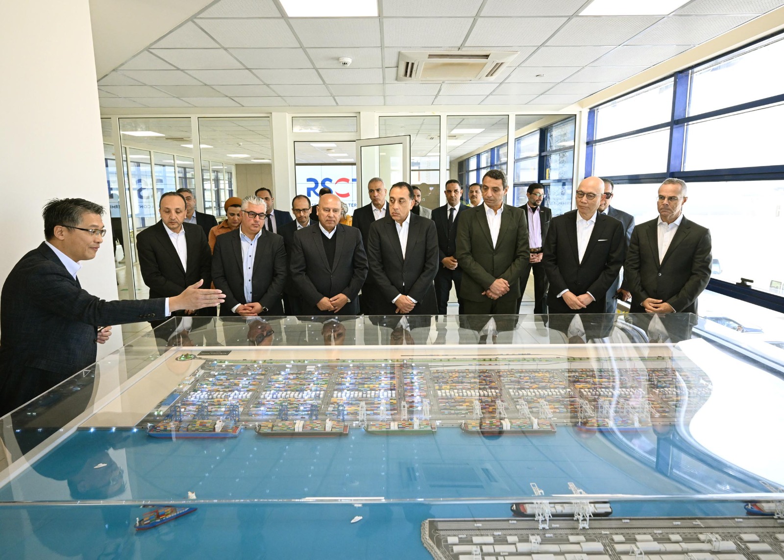 وحضر رئيس مجلس الوزراء مراسم التقاط صورة تذكارية جماعية مع السادة المشاركين في فعاليات الاحتفال بانطلاق التشغيل التجاري لمحطة البحر الأحمر لتداول الحاويات رقم 1 (RSCT) بميناء السخنة، والجولة التفقدية للمحطة، بالإضافة لعدد من مسئولي وزارة النقل، وهيئة قناة السويس، وكذلك المنطقة الاقتصادية لقناة السويس.