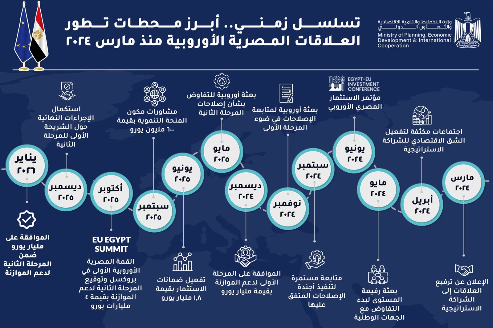 في التقرير التالي، تستعرض وزارة التخطيط والتنمية الاقتصادية والتعاون الدولي، التسلسل الزمني لأبرز محطات تطور العلاقات المصرية الأوروبية، منذ مارس 2024، وذلك عقب الإعلان عن حصول مصر على مليار يورو، تُمثل الشريحة الأولى من المرحلة الثانية لآلية مساندة الاقتصاد الكلي ودعم الموازنة MFA، حيث تضطلع الوزارة بمتابعة تنفيذ الشق الاقتصادي للشراكة بين الجانبين.