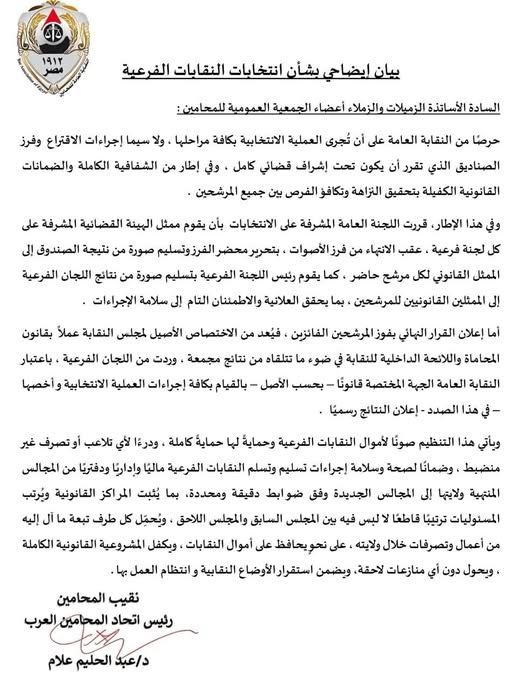 أصدرت نقابة المحامين، برئاسة الدكتور عبد الحليم علام، نقيب المحامين ـ رئيس اتحاد المحامين العرب، بيانًا إيضاحيًا بشأن انتخابات النقابات الفرعية، وجاء نص البيان كالتالي: