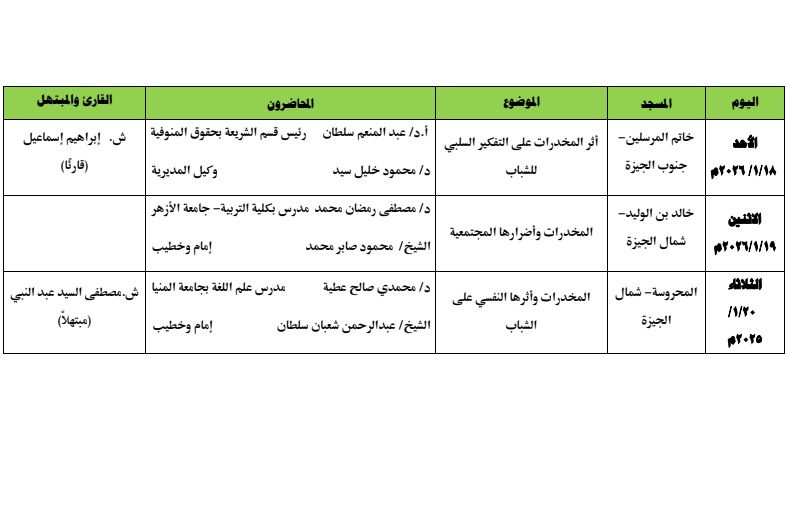 تعقد الوزارة الأسبوع الثقافي بمديرية أوقاف الجيزة بمساجد (خاتم المرسلين - خالد بن الوليد- المحروسة) من يوم الأحد 1/18/ 2026 حتى يوم الثلاثاء 1/20/ 2026 عقب صلاة العشاء، وذلك فى إطار دور وزارة الأوقاف العلمى والدعوى والتثقيفى لتحقيق مقاصد الشريعة وتقديم خطاب دينى وسطي رشيد.
