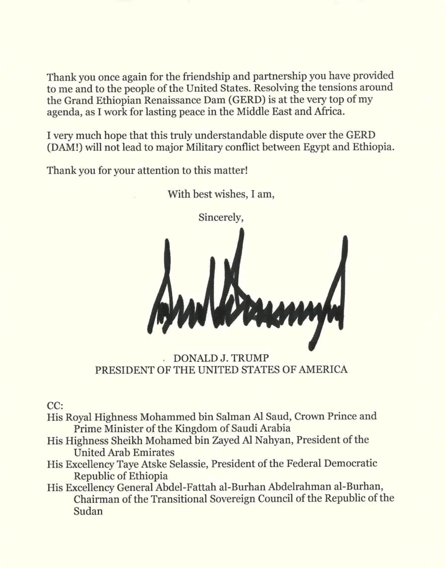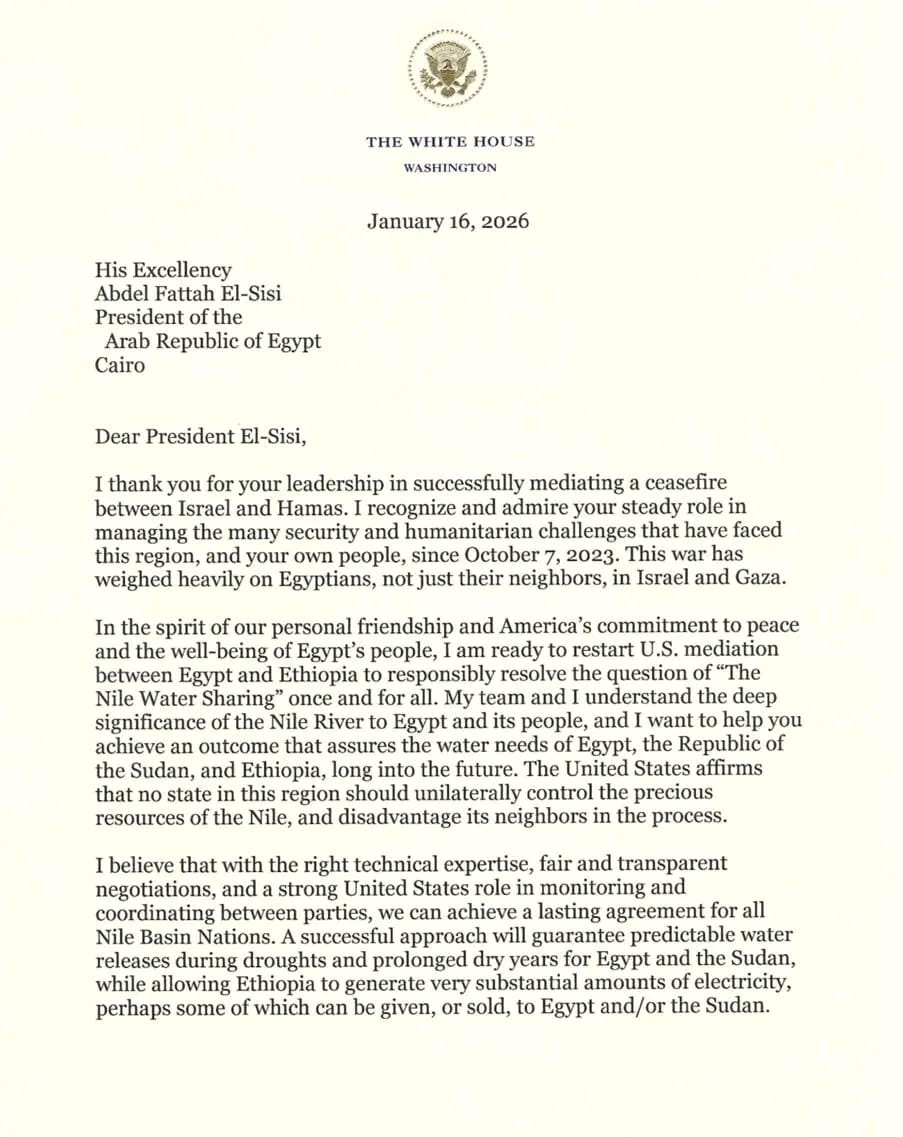 وانطلاقًا من روح صداقتنا الشخصية والتزام الولايات المتحدة بالسلام وبخير ورفاه شعب مصر، فأنا مستعد لاستئناف الوساطة الأميركية بين مصر وإثيوبيا من أجل حلّ مسألة “تقاسم مياه النيل” بمسؤولية، مرةً وإلى الأبد. إنني أنا وفريقي ندرك الأهمية العميقة لنهر النيل بالنسبة إلى مصر وشعبها، وأريد مساعدتكم على تحقيق نتيجة تضمن احتياجات المياه لمصر وجمهورية السودان وإثيوبيا، لسنوات طويلة مقبلة. وتؤكد الولايات المتحدة أنه لا ينبغي لأي دولة في هذه المنطقة أن تسيطر من جانب واحد على الموارد الثمينة لنهر النيل، بما يضر بجيرانها في هذه العملية.