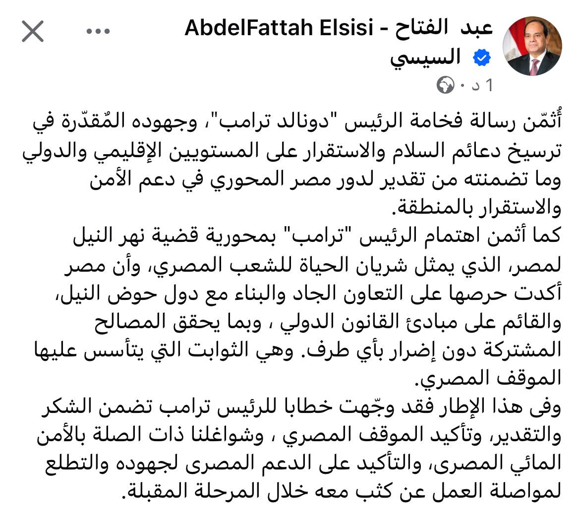 وأضاف: "كما أثمن اهتمام الرئيس "ترامب" بمحورية قضية نهر النيل لمصر، الذي يمثل شريان الحياة للشعب المصري، وأن مصر أكدت حرصها على التعاون الجاد والبناء مع دول حوض النيل، والقائم على مبادئ القانون الدولي ، وبما يحقق المصالح المشتركة دون إضرار بأي طرف. وهي الثوابت التي يتأسس عليها الموقف المصري".