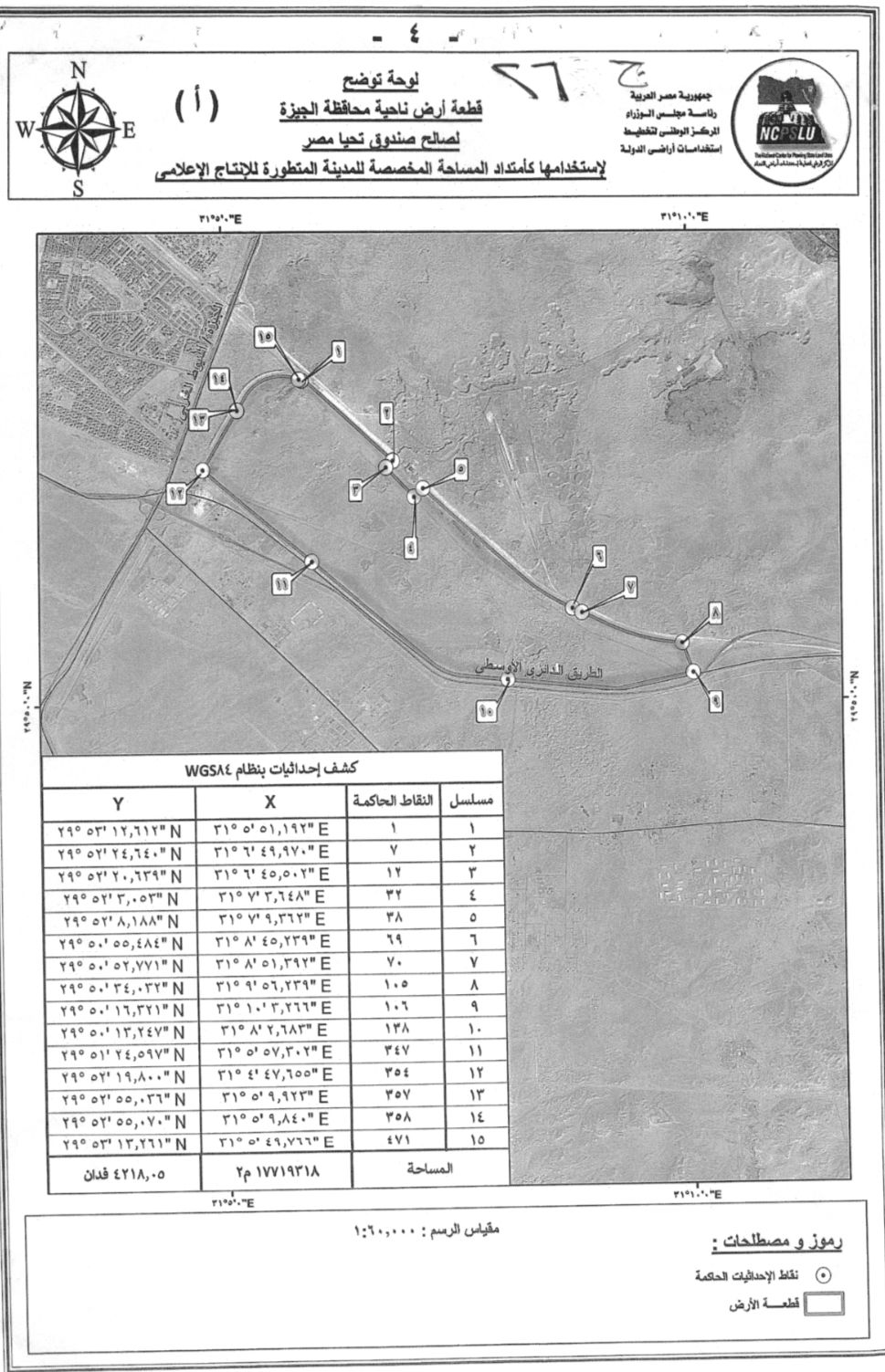 قطعة أرض بمساحة 4218.05 فدان تقريبا تعادل 17719318 متر مربع ناحية محافظة الجيزة، وفقا للوحة وجدول الإحداثيات المرفقين ويرمز لها بالحرف (أ).