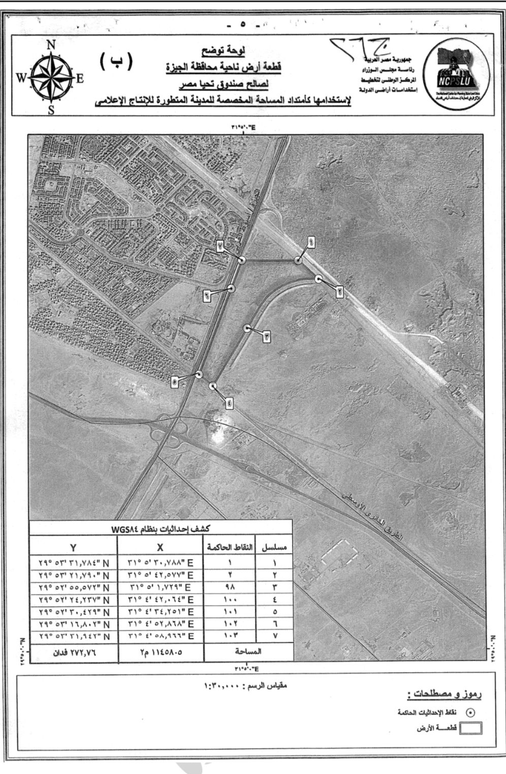 قطعة أرض بمساحة 272.76 فدان تقريبا تعادل 1145805 متر مربع ناحية محافظة الجيزة، وفقا للوحة وجدول الإحداثيات المرفعين ويرمز لها بالحرف (ب).