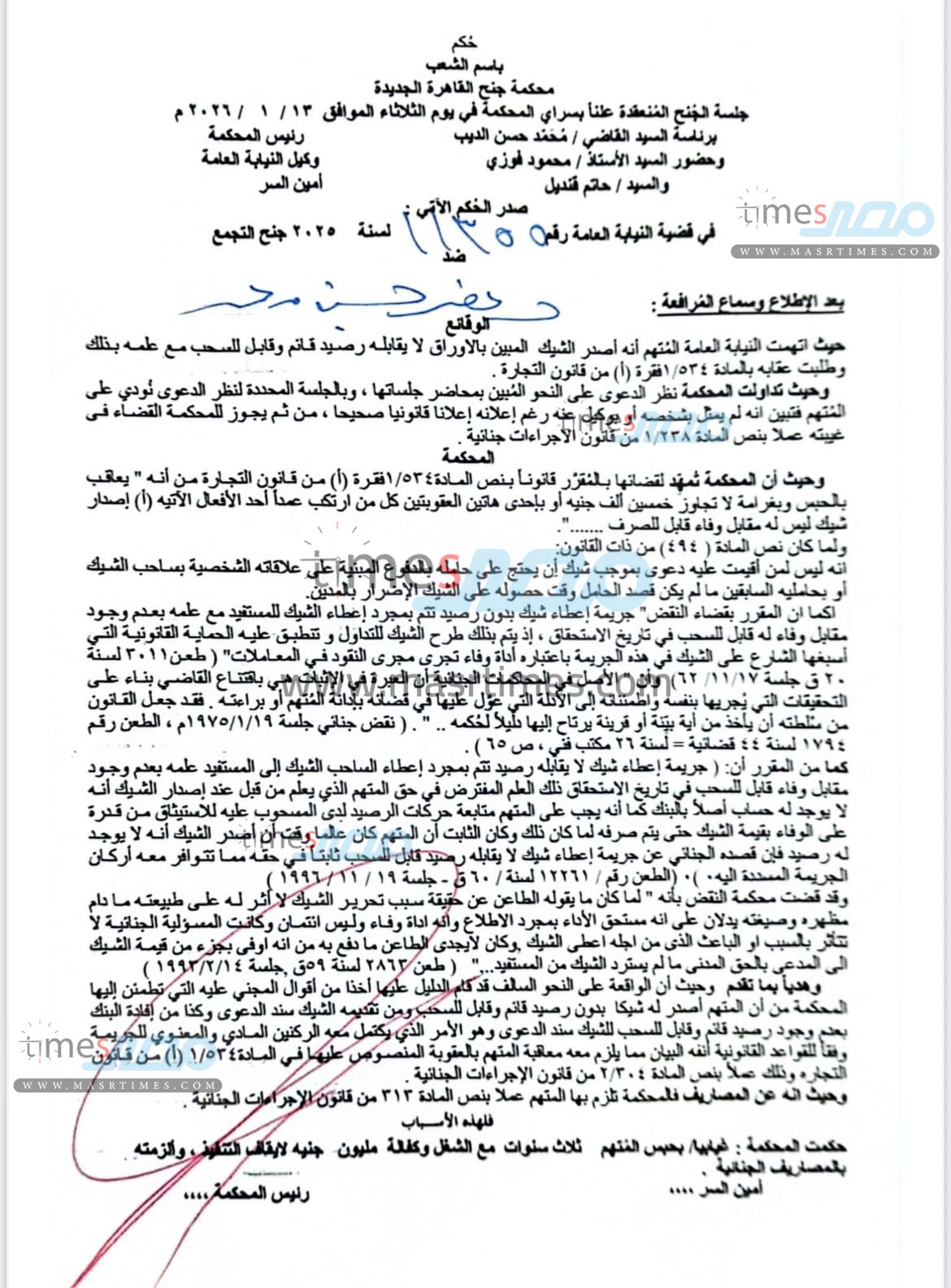 وجاء في حيثيات الأحكام أن المتهم أصدر شيكًا بنكيًا بدون رصيد قابل للصرف، بالمخالفة لأحكام المادة 534 من قانون التجارة، بعد ثبوت عدم وجود رصيد قائم وقابل للسحب وقت إصدار الشيك، وهو ما استقر عليه قضاء محكمة النقض باعتبار أن جريمة إصدار شيك بدون رصيد تتحقق بمجرد تسليم الشيك للمستفيد مع علم الساحب بعدم وجود مقابل وفاء.