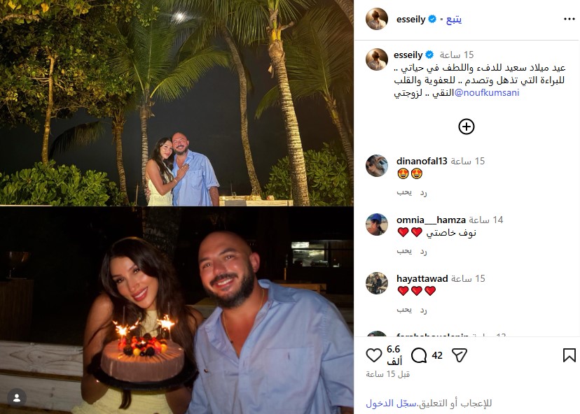 احتفل الفنان محمود العسيلي بعيد ميلاد زوجته نوف قمصاني، الذي يتزامن مع اليوم الأربعاء، الموافق 28 يناير.