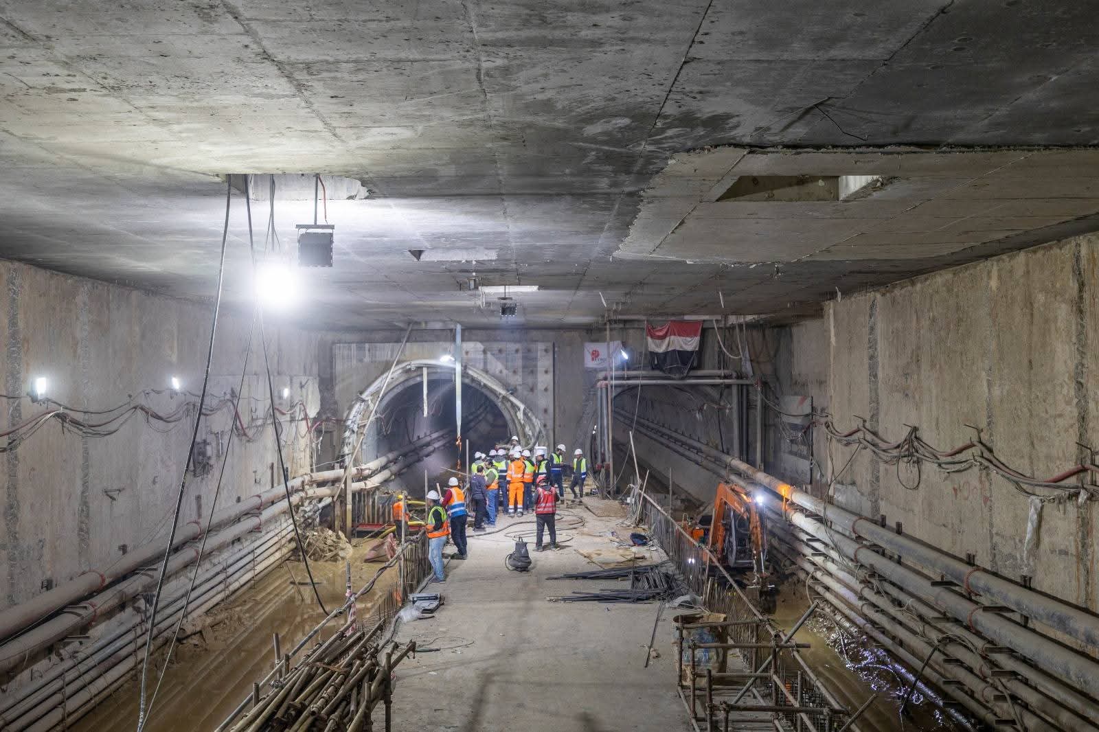 3- يجري حالياً تنفيذ الأعمال الإنشائية بالمرحلة الأولى بالمحطات كذلك أعمال الحفر النفقي و تتقدم معدلات تنفيذ أعمال الحفر النفقي للنفقين بالجزء الأول من المرحلة الاولى (نفق لكل إتجاه) بواسطة 4 ماكينات حفر نفقي (2 ماكينة لكل إتجاه ) حيث وصلت الماكينة الأولى الى محطة المتحف المصرى الكبير والثانية الى محطة الرماية والثالثة فى الطريق الى محطة مدكور والرابعة فى الطريق الى محطة الطالبية