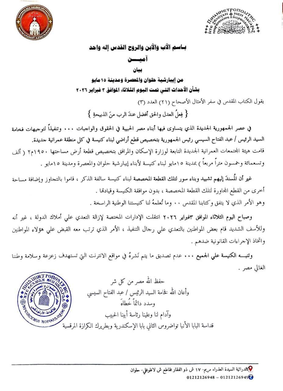 أصدرت إيبارشية حلوان والمعصرة بياناً رسمياً توضح فيه ملابسات الأحداث التي وقعت اليوم بمدينة 15 مايو، مؤكدة على تمسكها بالقانون ورفضها لأي تجاوزات، ومشددة على ضرورة تحري الدقة وعدم الانسياق وراء الشائعات التي تستهدف زعزعة الأمن والاستقرار.