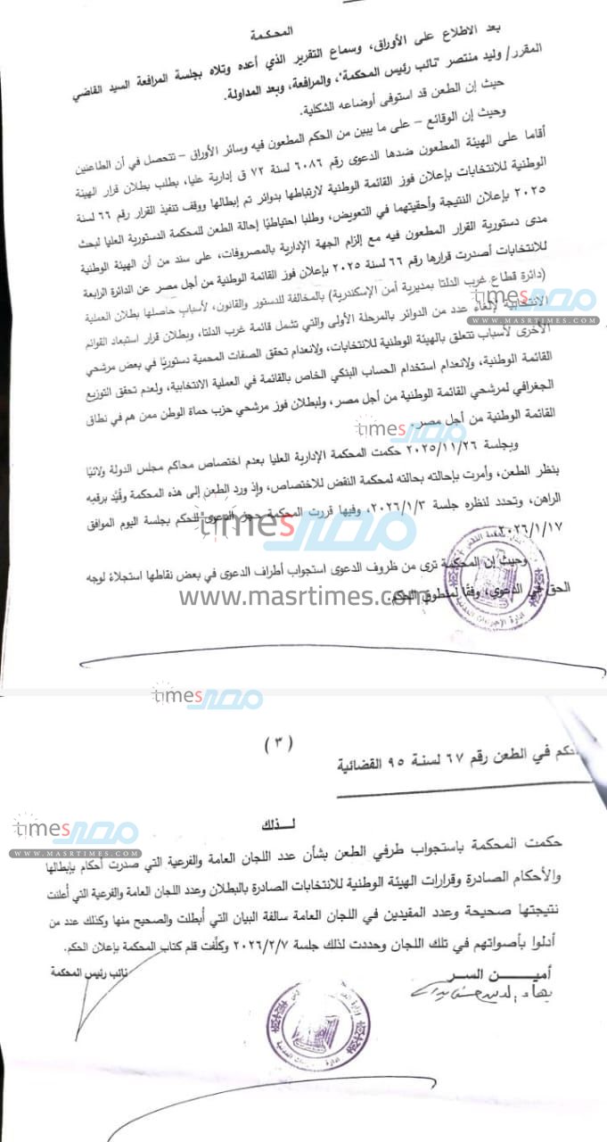 وذلك في الطعن الذي حمل رقم 67 لسنة 95 قضائية، طعون مجلس النواب، المقام من حنان عثمان إسماعيل وياسر عبدالعاطي أيوب ضد رئيس الهيئة الوطنية للإنتخابات والذي يطالب ببطلان إعلان فوز القائمة الوطنية بانتخابات النواب وخاصة قائمة غرب الدلتا .