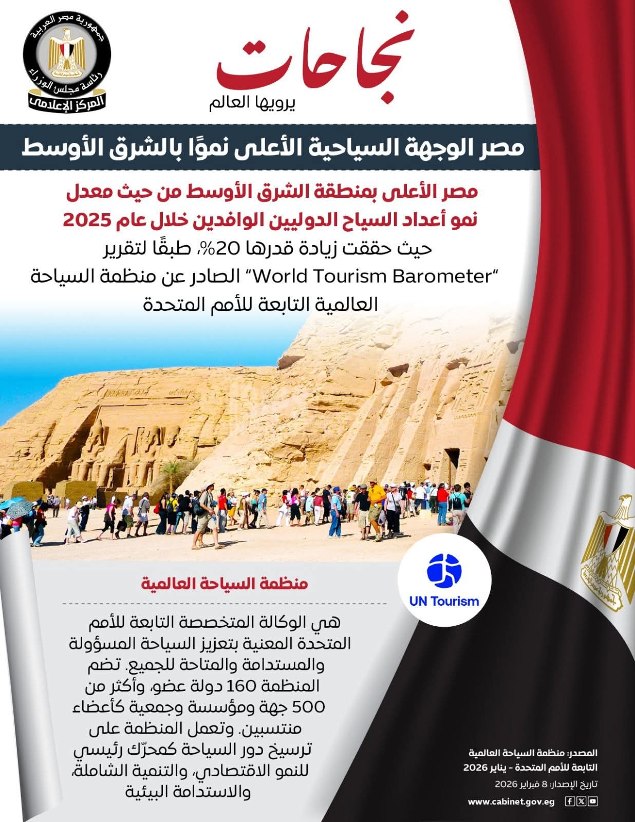 بعد عام استثنائي أعاد رسم مكانة مصر على خريطة السياحة العالمية، مدفوعًا بافتتاح المتحف المصري الكبير وتطورات نوعية في قطاع الفندقة، رصد تقرير World Tourism Barometer الصادر عن منظمة السياحة العالمية التابعة للأمم المتحدة في يناير 2026 تصدر مصر دول الشرق الأوسط في معدل نمو أعداد السياح الدوليين الوافدين بنسبة 20% خلال عام 2025، متجاوزة متوسط نمو المنطقة البالغ 3%.