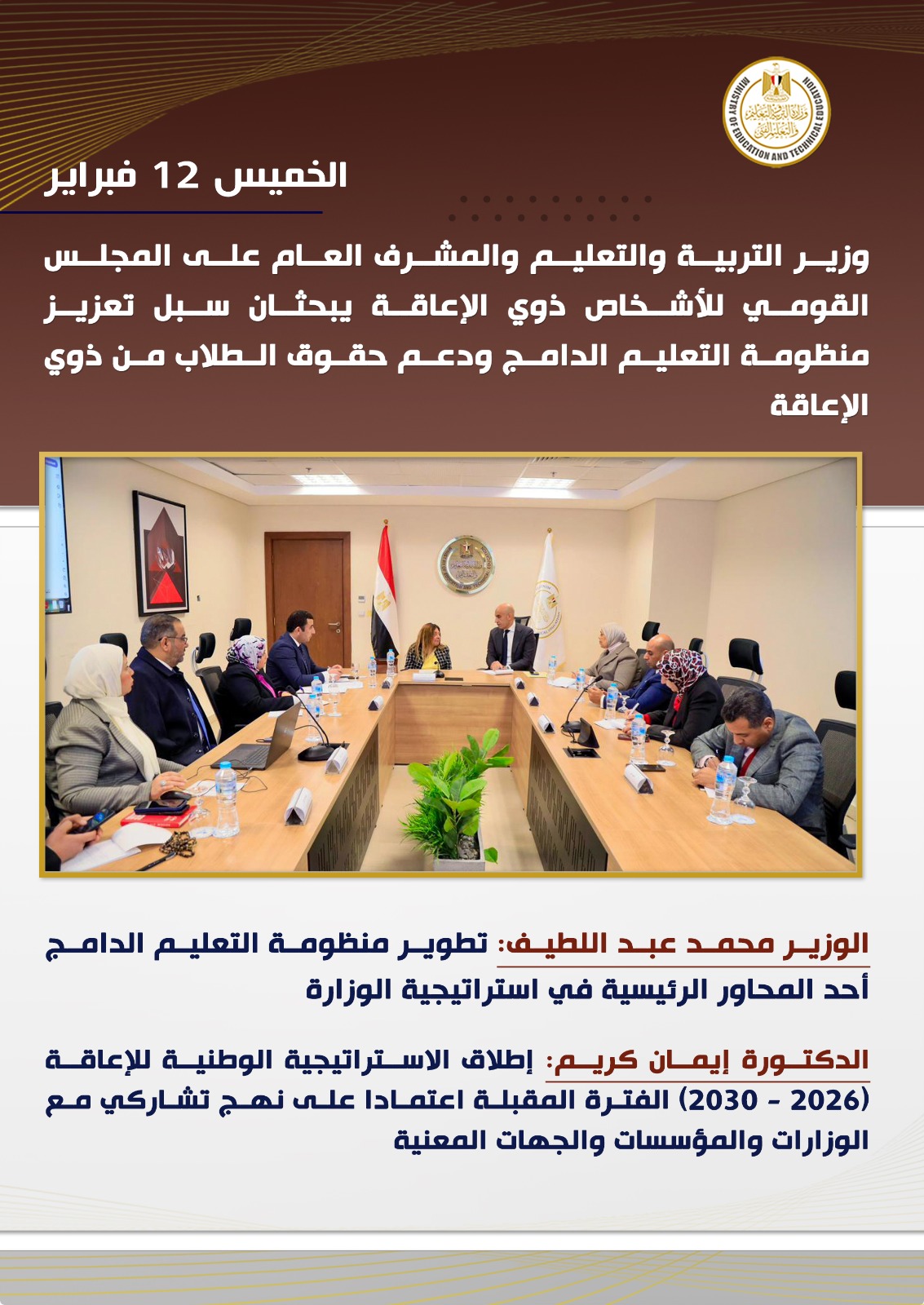 وفي ختام الاجتماع، أكد السيد الوزير أن الوزارة مستمرة في تبني سياسات تعليمية شاملة تستهدف بناء نظام تعليمي عادل ومتكافئ يضمن حق جميع الطلاب في تعليم جيد دون تمييز، مشيرًا إلى أن تمكين الطلاب ذوي الإعاقة يمثل استثمارًا حقيقيًا في مستقبل الوطن.