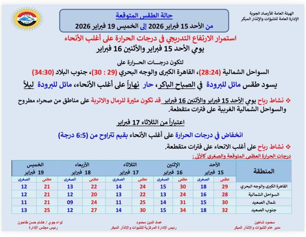 جاءت درجات الحرارة العظمى والصغرى المتوقعة خلال الفترة من الأحد 15 فبراير حتى الخميس 19 فبراير على النحو التالي: