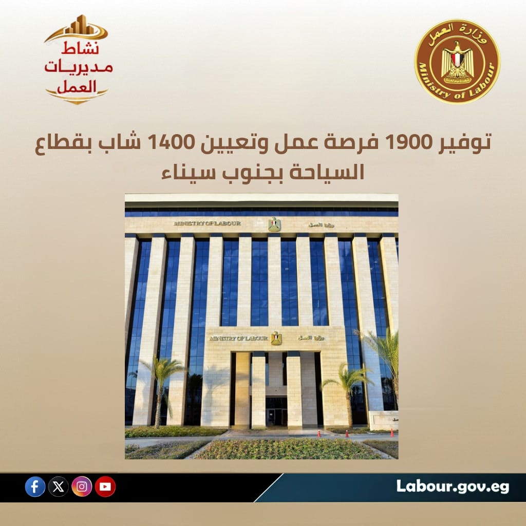 أعلنت مديرية العمل بجنوب سيناء، برئاسة أكرم محمد سيد أحمد، عن توفير 1900 فرصة عمل بالقطاع السياحي، تم تعيين 1400 شاب وفتاة منها خلال شهر يناير، في إطار دعم استقرار سوق العمل بمدينة شرم الشيخ....كما تابعت المديرية تنفيذ خطة إخلاء بأحد الفنادق السياحية، إلى جانب عقد ندوة توعوية للعاملات حول حقوق المرأة في قانون العمل الجديد، تعزيزًا لبيئة عمل آمنة ومستقرة.