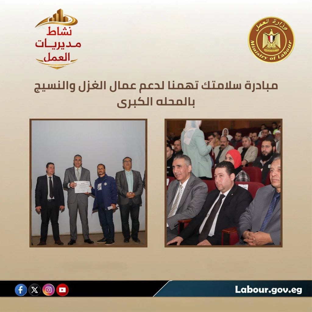 بالمركز الثقافي بمدينة المحلة الكبرى، لتعزيز إجراءات السلامة والصحة المهنية داخل قطاع الغزل والنسيج...وشهدت الفعاليات تسليم عقود عمل لعدد من ذوي الهمم بمصنع جي آر للمفروشات، الي جانب استمرار برامج التدريب المهني داخل المصانع في مجالات الزجاج والنسيج والتجميل ضمن مبادرة "75 ألف فرصة تدريبية"...كما ُعقدت ندوة حول الحوار الاجتماعي بعدد من المنشآت الصحية والصناعية لتعزيز بيئة عمل آمنة ومستقرة.