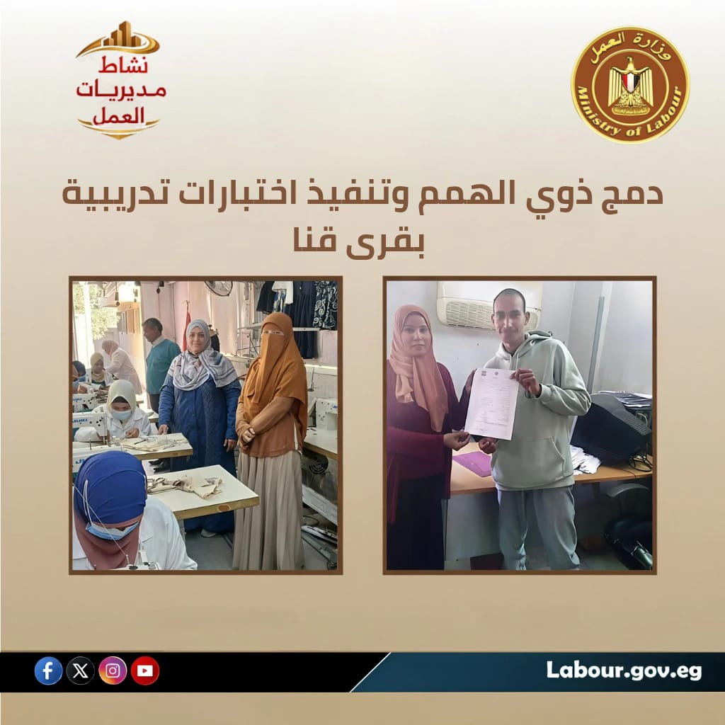 تواصل مديرية العمل بقنا، برئاسة الأستاذ أحمد معوض، جهودها في دعم تشغيل ذوي الهمم، حيث تم إتمام عقود عمل بعدد من الشركات، من بينها تساهيل وشركة الحبيب وشركة الفهد...كما أُجريت الاختبارات النهائية لدورة الخياطة بالوحدة المتنقلة بقرية القناوية، إلى جانب عقد ندوة توعوية داخل شركة اسكاتك للطاقة الشمسية بنجع حمادي حول السلامة والصحة المهنية.