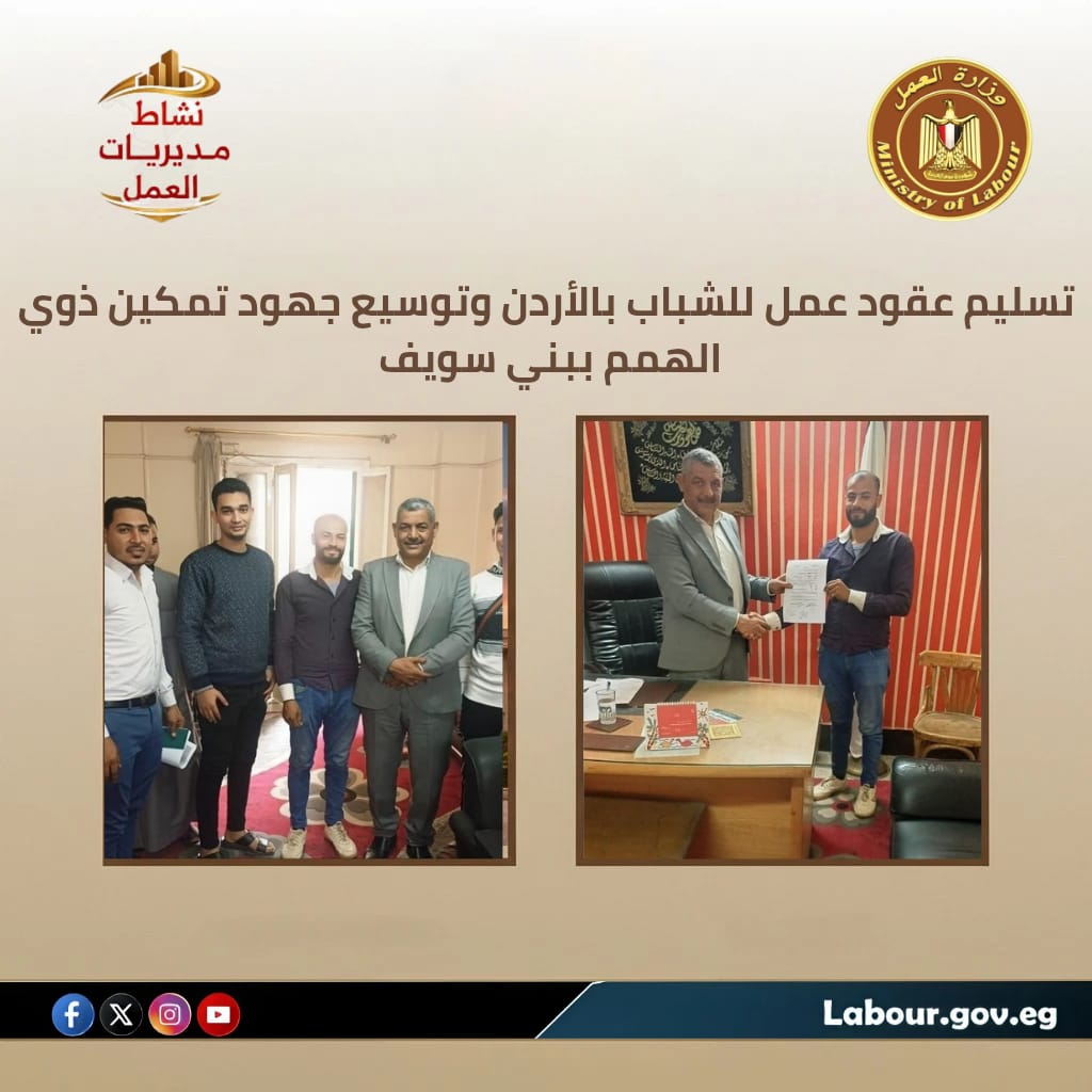 تسليم عقود عمل للشباب بالأردن وتوسيع جهود تمكين ذوي الهمم ببني سويف