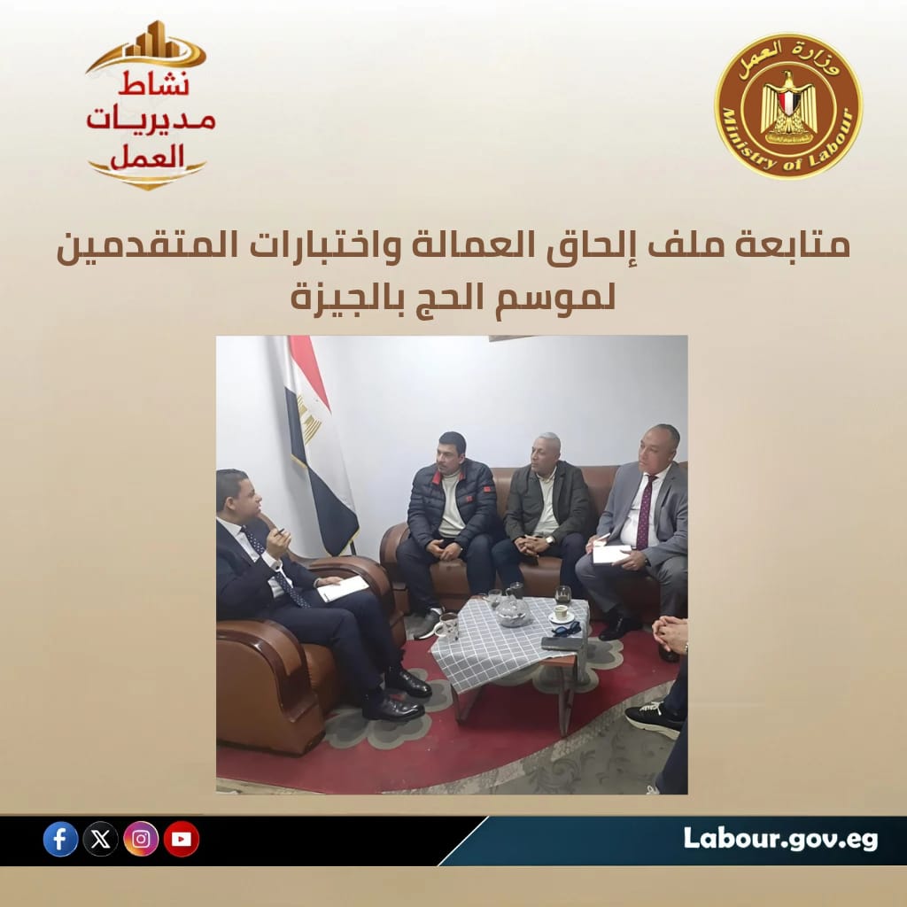 عقدت مديرية العمل بالجيزة، برئاسة الدكتور كريم أبو السعود، اجتماعًا مع شعبة شركات إلحاق العمالة، لبحث سبل تسهيل إجراءات سفر العمالة المصرية بالخارج وضمان حقوقها وفق الأطر القانونية المنظمة...كما تابعت المديرية اختبارات المتقدمين للعمل الموسمي خلال موسم الحج القادم، إلى جانب تنظيم ندوة توعوية بمستشفى العياط المركزي حول مخاطر بيئة العمل وأهمية الالتزام بإجراءات السلامة المهنية.