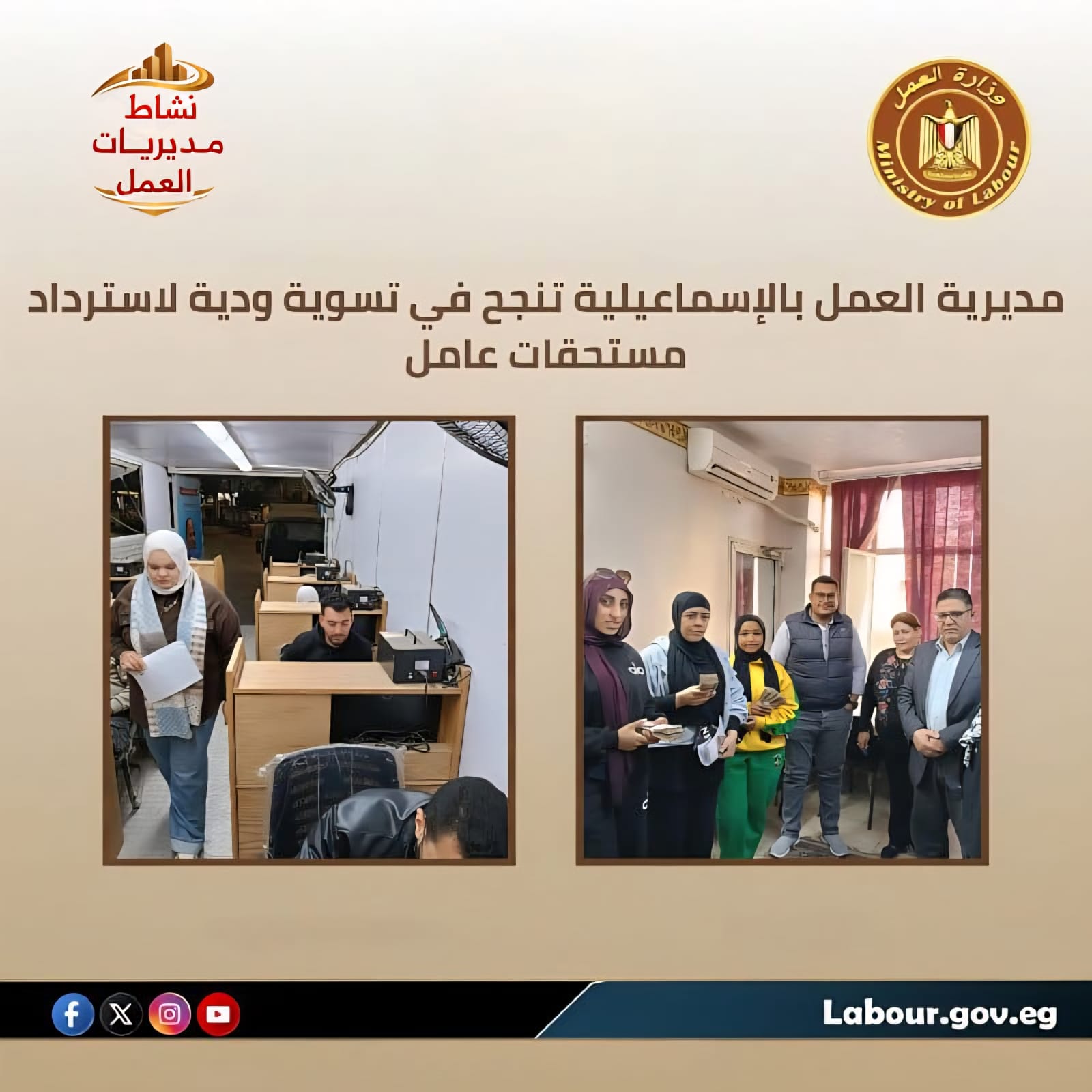 مديرية العمل بالإسماعيلية تنجح في تسوية ودية لاسترداد مستحقات عامل