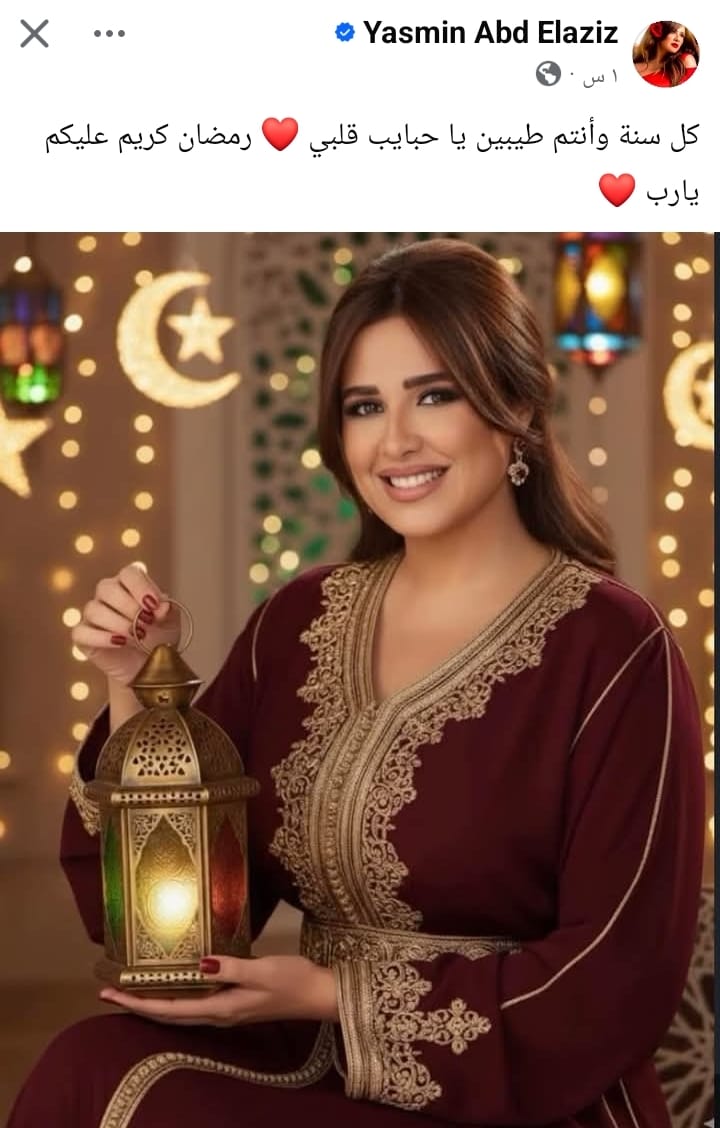 ونشرت ياسمين عبد العزيز صورة لها عبر حسابها على “فيس بوك”، وهي تحمل فانوسًا، بإطلالة رمضانية ساحرة، وعلقت عليها: «كل سنة وأنتم طيبين يا حبايب قلبي.. رمضان كريم عليكم يا رب».