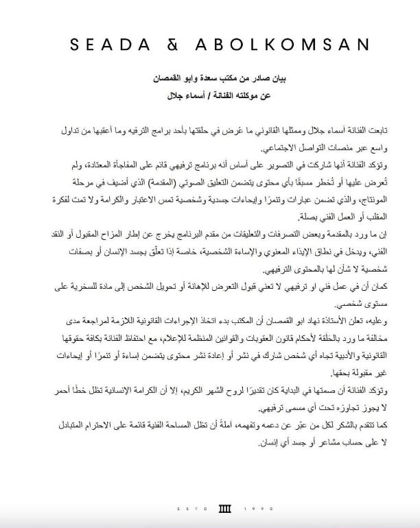 ومن جانبه أصدر مكتب نهاد أبو القمصان بيانًا رسميًا أعلنت فية أن مكتبها باتخاذ الإجراءات القانونية اللازمة لمراجعة ما ورد في الحلقة، وبيان مدى توافقه مع نصوص قانون العقوبات والقوانين المنظمة للعمل الإعلامي.