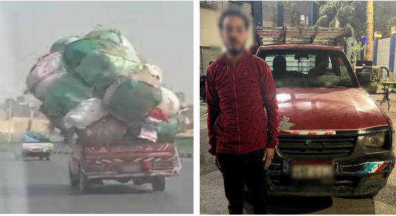 نجحت الاجهزة الامنية بوزارة الداخلية ، من كشف ملابسات مقطع فيديو تم تداوله بمواقع التواصل الإجتماعى تضمن قيام قائد سيارة "ربع نقل" بتحميل حمولة زائدة على سيارته حال سيره بإحدى الطرق بالقاهرة معرضاً حياته والمواطنين للخطر.