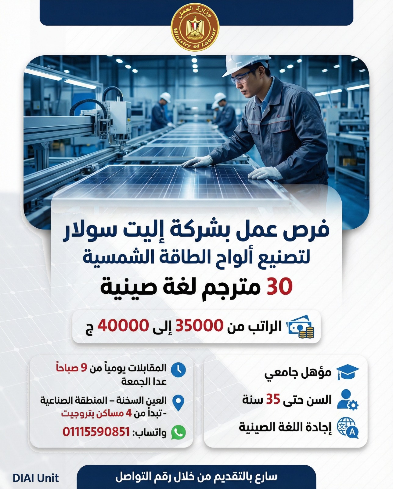 «العمل» تعلن عن 30 وظيفة مترجم لغة صينية لشركة تصنيع ألواح طاقة شمسية بالعين السخنة